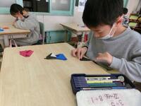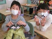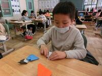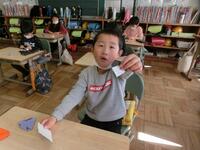 折り紙でひな人形を作りました。かわいい人形ができあがると、とてもうれしそうな表情で見せてくれました。