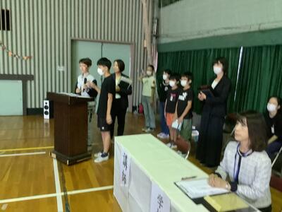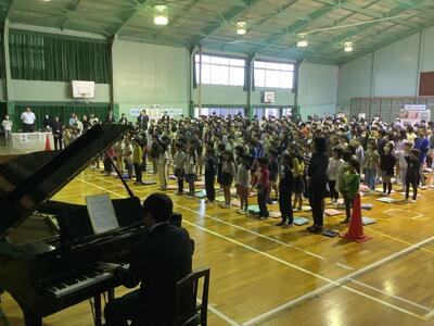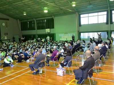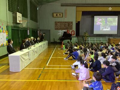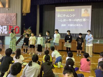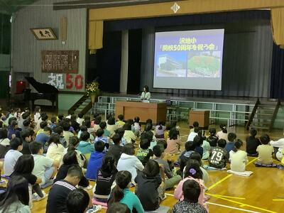 会の最後には、全員で「開校の歌」を歌いました。体育館中に子供たちの声が響き渡りました。心地よい雰囲気の中、全校で50周年をお祝いすることができました。