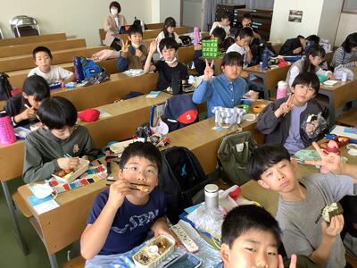 集合写真を撮り、次の場所である「明治なるほどファクトリー」に向かいます。ご飯も食べ終え、元気いっぱいの子供達です。