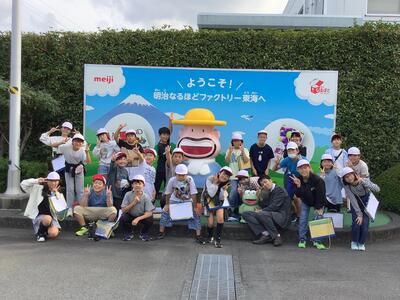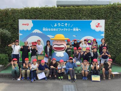 藤枝市にある「明治なるほどファクトリー」につきました。看板を見るやいなや、バスの中からでも「確かになんだか甘い匂いがする!」と話す子供達もいました。