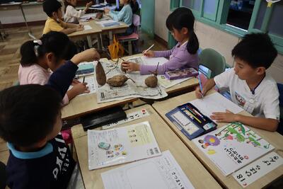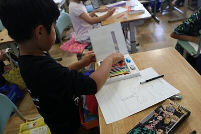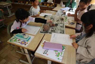 1年生が、収穫したさつまいもを観察して絵や文で表現しています。