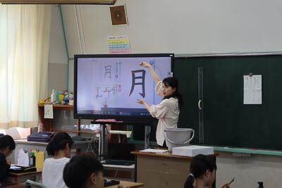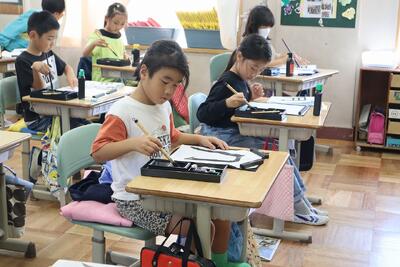 3年生の書写の授業では、「月」を毛筆で書いています。3年生、みんな良い姿勢で、字形に気をつけながら、勢いのある字を書くことができています。