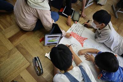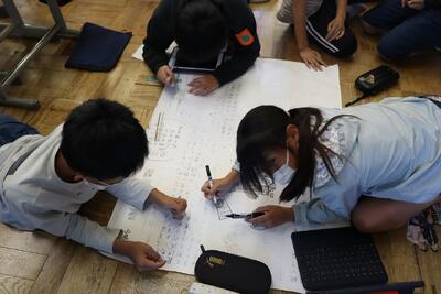 6年生が修学旅行で学んだことや感じたことを、友達といっしょにまとめています。小学校生活最高の思い出を、形にする活動の一つです。