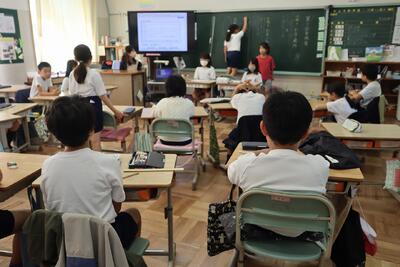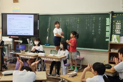 2年生の教室では、話合い活動に子供たちが挑戦していました。学年集会の内容について、自分の意見やその理由を発表したり、友達の意見について考えたりしていました。子供たちの力で司会や板書をしていきます。