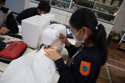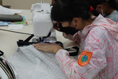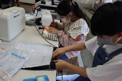 6年生が、家庭科の授業で、トートバッグをつくっています。ミシンを上手に使っています。、できあがりが楽しみです。
