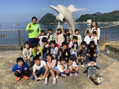 イルカのモニュメントの前で、クラスごとに集合写真を撮りました。