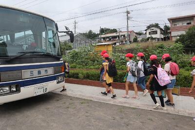 今日は、4年1組が三島めぐりにでかけました。学校を元気に出発しました。