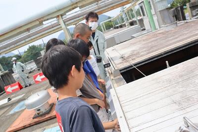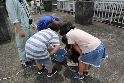 長伏の浄化センターに着きました。汚かった水がきれいになっていく様子を見て、子供たちはとても驚いていました。