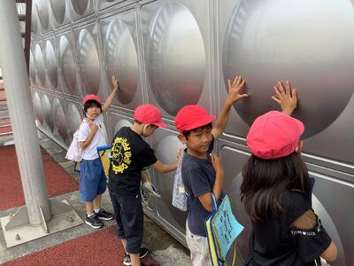 生活科の学習で、水遊びをしました。持ってきたペットボトルや容器にたくさん水を入れて、友達とかけ合ったり、遠くに飛ばしたりして楽しみました。