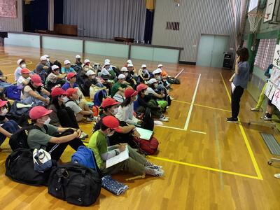 出発式での様子です。この自然教室の中で、①自分で考える ②友達の良いところを探す ③家族や周りの方々に感謝する…ということを意識してみましょうと、校長先生からお話がありました。