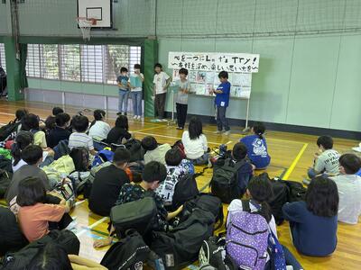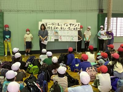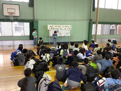 先日、地域の方や警察の方を招いて6年生が交通安全リーダーと語る会を行いました。今回は一年生に対しての発表でした。聞いている一年生の態度も6年生の発表もとても素晴らしかったです。