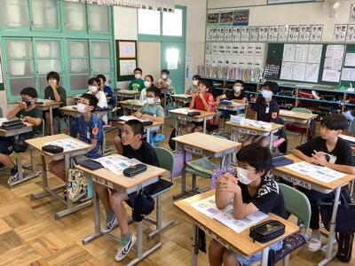 朝の時間に4年生の教室では、子供たちが、保健室の先生と栄養士さんのお話を聞きました。猛暑が厳しい毎日です。「熱中症にならないために、水分をしっかりとりましょう。」とお話がありました。普段と激しい運動をしたとき、どのような水分補給をしたら良いのか、わかりました。栄養士さんからは、ジュースの中に含まれている砂糖の量について、わかりやすく説明をしていただきました。子供たちは、反応しながらしっかりとお話を聞くことができました。自分の身体を自分で守るために、大切なことを知りました。