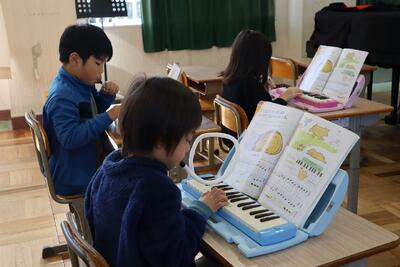 2年生が、音楽の授業で鍵盤ハーモニカの練習をしています。指使いに気をつけて、上手に演奏できるようになってきました。