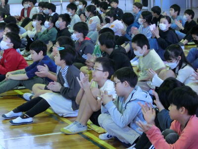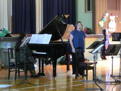 開校50周年を記念して、「みしませせらぎアンサンブル」の皆さんにお越しいただき、演奏していただきました。子供たちは生で聞く楽器や歌声に聞き入っていました。