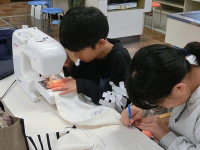 ミシンを使ってエプロン作りに励んでいます。友達と助け合ったり、ボランティアさんにアドバイスをもらったりしながら、みんな楽しそうに作業に取り組んでいました。