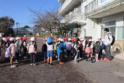 1年生が、秋の青空の下、「いってきます。」と元気にあいさつをして、上岩崎公園に出発です。友達といっしょに、たくさんの秋を見つけてくださいね。