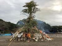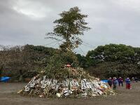 どんど焼きの「やぐら」に火が燃え広がっている様子です。どんど焼きには、正月飾りを目印に家に来てくださった年神様を、正月飾りを燃やした煙とともに見送るという意味があります。