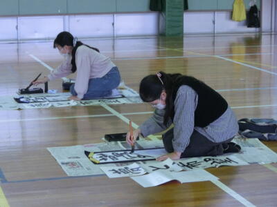 体育館で書き初めの練習をしました。今年の6年生の課題は「夢と希望」です。みんな集中して練習に励んでいました。