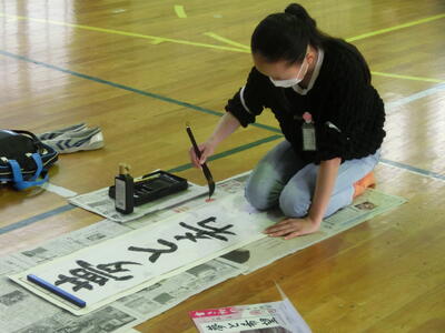 体育館で書き初めの練習をしました。今年の6年生の課題は「夢と希望」です。みんな集中して練習に励んでいました。