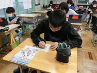 この日は「硬筆」で手紙の書き方の学習をしました。間もなく新年を迎える時期なので、年賀状の正しい書き方を、実際の年賀はがきを使って練習しました。住所や文章を書き終えると、空いているスペースに来年の干支であるウサギの絵を描いている子がたくさんいました。