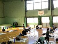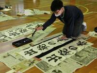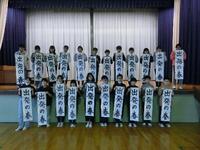 体育館で書き初めの練習をしました。今年の6年生の字は、「出発の春」です。授業の最後に、自分の作品を持って、みんなで記念写真を撮りました。