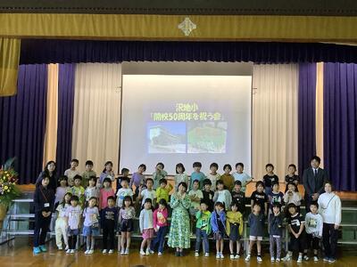 会の最後には、全員で「開校の歌」を歌いました。体育館中に子供たちの声が響き渡りました。心地よい雰囲気の中、全校で50周年をお祝いすることができました。