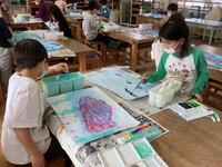 前回、画用紙で型を作ってクレヨンでスイミーや魚たちを描いた子供たち。今回は、仕上げに、他の大きな生き物を絵の具で書き足したり、ペットボトルキャップを使って水の泡をスタンプしたりしました。素敵な海の世界ができあがりました。