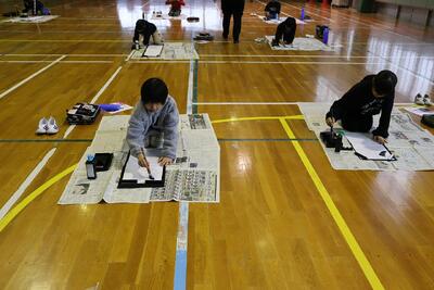 4年生が書写の時間に、書き初めの練習に取り組んでいます。今日の授業は、体育館で行いました。