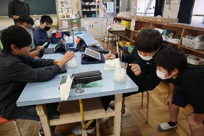 5年生の理科の授業では、流れる水のはたらきについて、友達といっしょに実験を行っていきます。声を掛け合って、まずは実験の準備です。