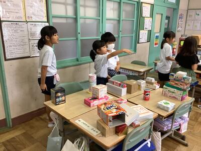 1年生の算数の授業では、家から持ってきた箱を「かたち」に分類していきます。グループで確認し合うことで、楽しみながら学習することができます。