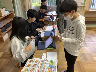 5年生の外国語の授業で、英語を使った「お買い物ごっこ」を行いました。What would you like?(何になさいますか?)I'd like a hamburger.(ハンバーガーを1つ、いただきたいです。)など、5つのファーストフード・レストランで、丁寧な表現を使った注文のやりとりを上手にすることができました。「ドリンクは、ワットサイズ?」「〜セット、プリーズ!」と、工夫しながら楽しんでいる様子が見られました。