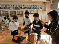 さまざまな打楽器の音の響きを確かめ、さらに音の強弱や、音の長さなどを工夫して音楽作りに励みました。よく見慣れた「カスタネット」や「トライアングル」などの楽器に加え、ふだんあまり見慣れない「ボンゴ」や「コンガ」、「ヴィブラスラップ」などの楽器も使って、子供たちは楽しそうに演奏していました。
