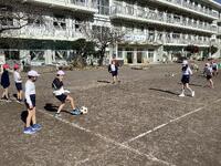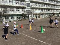 4年生の体育の学習では、ゴール型ゲームを行っていきます。まずはドリブルやパスの練習をしています。金曜日の授業の後半は、パスゲームとして、コーンの間にパスを通すゲームを行いました。自分の思い通りにボールをけることの難しさ、パスを上手くできたときの達成感を味わっていました。