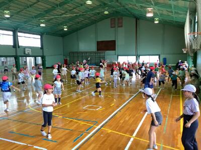 5年生の体育の様子です。自然教室のキャンプファイヤーの時間にクラスごと、創作ダンスを披露する予定です。自然教室ではクラスで4つの班があるため、1曲を4分割し、班ごとの担当を決め、振り付けを考えています。曲のリズムに合わせて、試行錯誤しながら楽しく活動していました。