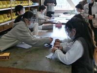 4年1組のお店 「目指せ!防災マスター!」の様子です。このお店では、防災についてクイズや体験を通して知ることができるお店です。どの子も自信をもってお店を運営しており、本番にも向けて練習してきた成果が出ていました。新聞紙を用いた防災スリッパには、「こんなに簡単に作れるんだ!」と、驚いているお客さんが多かったです。