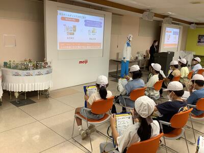 藤枝市にある「明治なるほどファクトリー」につきました。看板を見るやいなや、バスの中からでも「確かになんだか甘い匂いがする!」と話す子供達もいました。