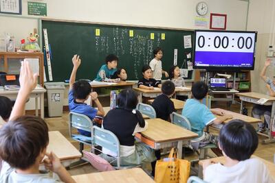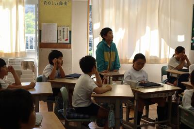 2年生の教室では、話合い活動に子供たちが挑戦していました。学年集会の内容について、自分の意見やその理由を発表したり、友達の意見について考えたりしていました。子供たちの力で司会や板書をしていきます。