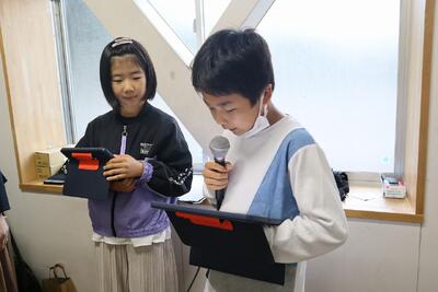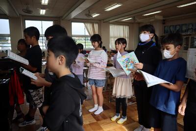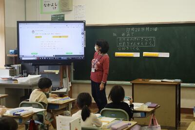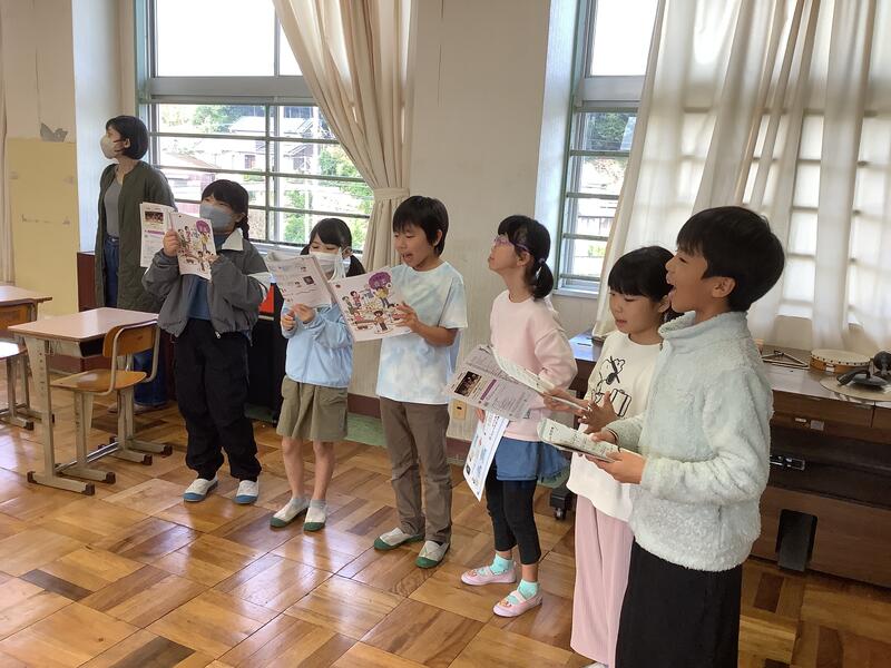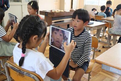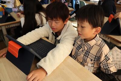 2年生音楽の授業では、楽器を使って「かぼちゃ」の曲を演奏し、発表しました。友達の前で練習の成果を発表し、友達から「じょうず!」と大きな拍手をもらっていました。最後の振り返りでは、タブレット端末の動画撮影機能をつかって、自分の感想を伝え合うことができました。