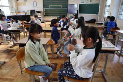 朝の時間に、6年生がペアの1年生に修学旅行についてのお話に行きました。修学旅行の楽しい思い出について、6年生が自分の作った修学旅行新聞や写真を見せながら、紹介しました。興味深そうに話を聞く1年生です。昨日は、6年生が5年生に修学旅行について紹介に行きました。5年生も、6年生の話を聞いて、来年度の修学旅行について、イメージを持つことができたようです。