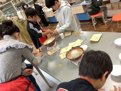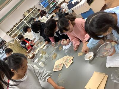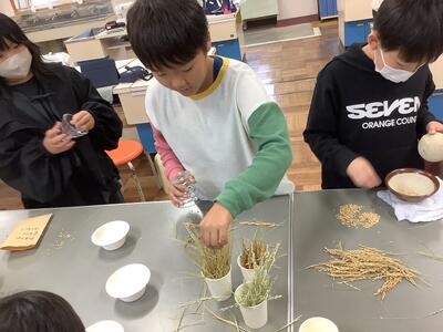 バケツで育てた稲を収穫した5年生が、今度は、乾燥させた稲を、脱穀、籾すりする作業を続けています。