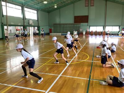 5年生の体育の様子です。自然教室のキャンプファイヤーの時間にクラスごと、創作ダンスを披露する予定です。自然教室ではクラスで4つの班があるため、1曲を4分割し、班ごとの担当を決め、振り付けを考えています。曲のリズムに合わせて、試行錯誤しながら楽しく活動していました。
