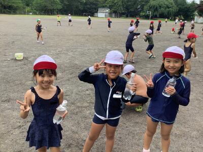 生活科の学習で、水遊びをしました。持ってきたペットボトルや容器にたくさん水を入れて、友達とかけ合ったり、遠くに飛ばしたりして楽しみました。