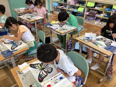 2年生の図工の様子です。小学校に入って初めての絵の具を使う授業で、「カラフルちょうちょ」の色を塗りました。道具の名前、使い方、片付け方をしっかり学習したあと、少しずつ丁寧にちょうちょの模様に色を塗りました。