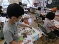 2年生の図画工作の学習では、はじめて自分の絵の具を使って絵を描いています。混色やいろいろな塗り方を試しました。