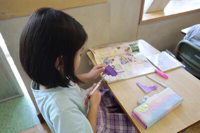 1年生の図工の授業では、子供たちが折り紙で「ちょきちょきかざり」にチャレンジです。折り紙を折ってからはさみでちょきちょき。上手にはさみをつかえる1年生です。折り紙を広げるとすてきな「ちょきちょきかざり」のできあがりです。