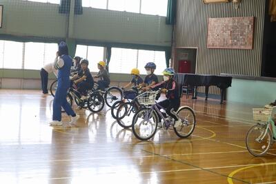 4年生が、自転車の乗り方教室を行いました。ヘルメットをしっかりかぶり、安全確認をしながら、走行する練習をしました。自分の命を守り、自転車の安全な走行の仕方を体験することができました。