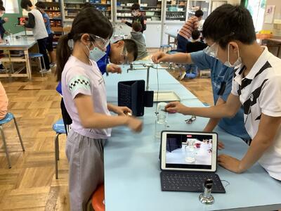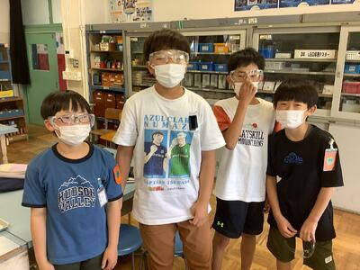 今日は、石灰水を使って、物が燃えた後の空気はどのように変化したのかを確かめました。実験の前に理科支援員の先生から、危険を伴う実験への心構えについてお話をいただき、真剣に取り組むことができました。