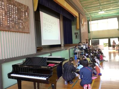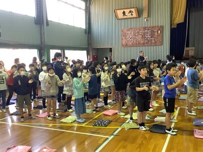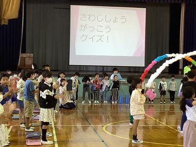 全校が体育館に集まり「1年生をむかえる会」が開かれました。沢地っこがみんなで集まって、各学年の出し物を披露するのは3年ぶりです。6年生と手をつないで、うれしそうに入場してきた1年生の子達は、3年生のジャンボリ・ミッキーと「はじめのことば」、2年生の「あいさつの歌」、4年生の「沢地小・校歌」、5年生の「沢地っこ体操」、6年生の「さわじしょうクイズ」をめいっぱい楽しんで大きな拍手をしていました。