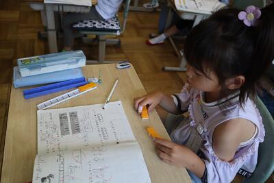 1年生の算数の授業では、たしざんの学習活動を進めています。今日の授業では、問題文について、式を書いたり、ブロックを動かして、答えを求めたりしていきました。ブロックを動かしながら、友達に説明をすることも大切です。