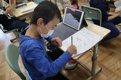 3年生の理科の授業では、子供たちが春の自然について、たくさんの発見をしています。校庭で見つけた花や生き物など、タブレットで写真や動画を撮り、その資料を活用しながら、絵や説明で表現していきます。いきいきと自分の気付きを書く子供たち、すてきな表情をしています。